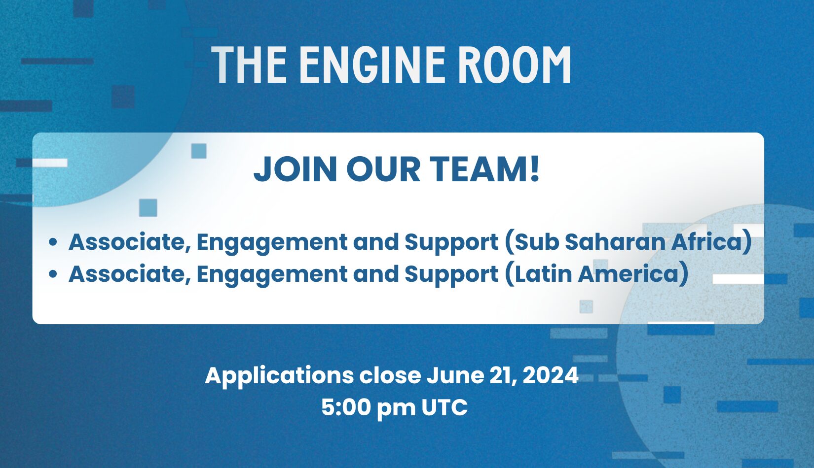 ![[closed] Join our team! Two Associates for Engagement & Support](https://www.theengineroom.org/wp-content/uploads/2024/06/HIRING-ENGAGMENT-ASSOCIATES-1650-x-950.jpg)